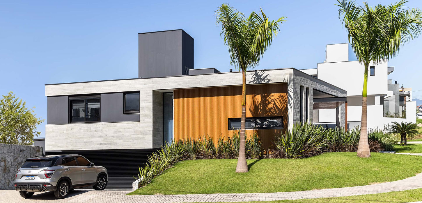 Desenvolvido para uma família de quatro pessoas, este projeto se destaca por um bloco único de concreto aparente que envelopa a casa. Os rasgos no monobloco, bem como a marquise em estrutura metálica angulada traz um movimento ímpar e destaca o acesso principal.